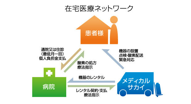 医療機関との連携により、在宅酸素療法用装置・人工呼吸器等の必要な患者様に安全・安心をお届けします。